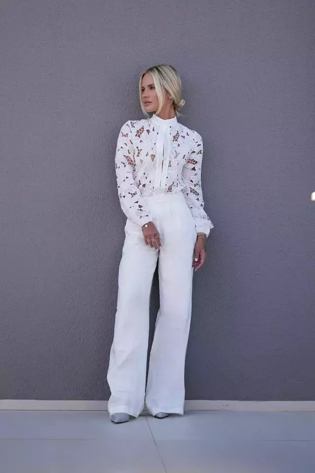 Delicadeza e sofisticação definem a Camisa Mali, confeccionada em renda guipir na clássica e atemporal cor off white. Com detalhes trabalhados em alto relevo, o tecido traz um toque romântico e refinado, ideal para composições elegantes e femininas.