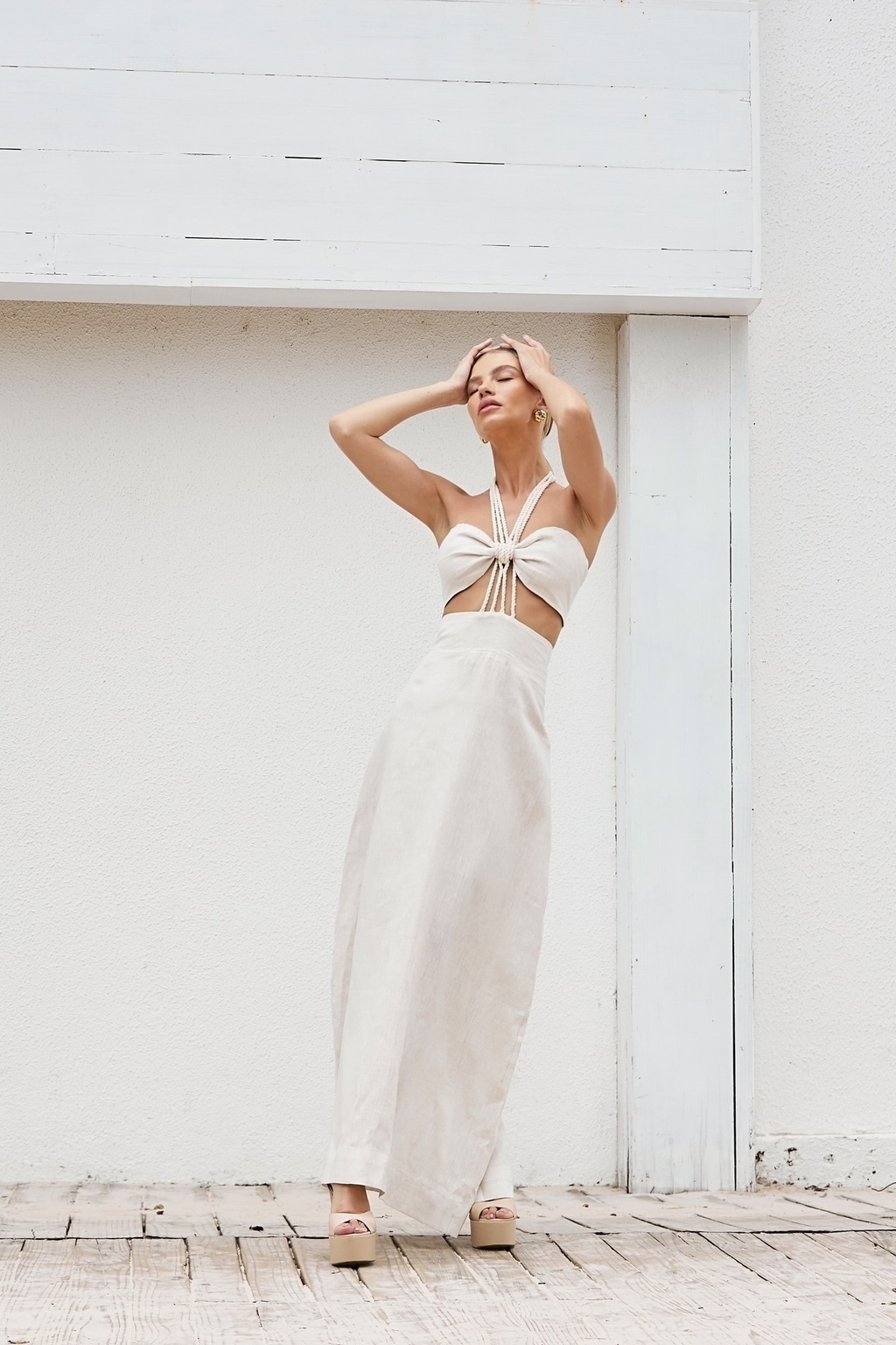 VESTIDO NORONHA longo em LINHO 100% NATURAL, com modelagem fluida e desenvolvida para valorizar a silhueta feminina. Possui aplicações em cordas no busto, trazendo toda a inovação e diferencial da peça. Possui aplicação em lastex na parte das costas, junto ao ajuste regulável e zíper invisível, tudo para promover a modelagem perfeita ao corpo.
